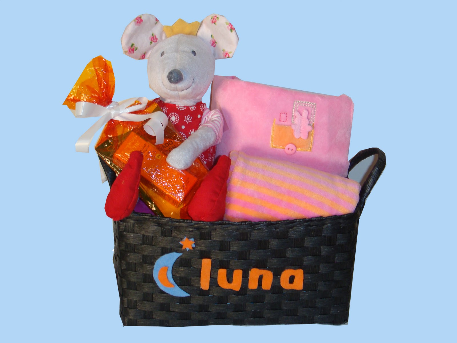 Set de baño muy práctico, puesto que los productos que lo componen son de uso cotidiano, y muy personalizado, porque no pueden faltar en el aseo de la persona que lo recibió.