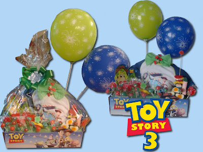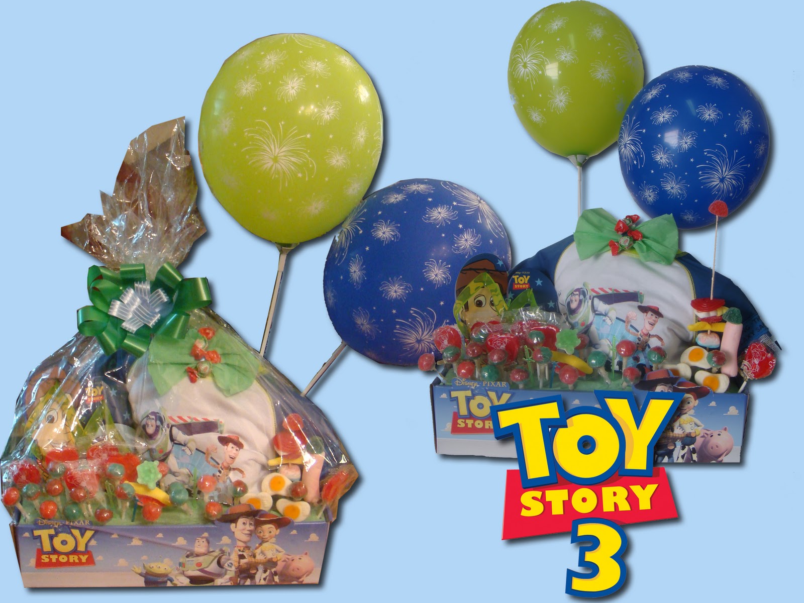 La última película de toy story 3, fue el tema de inspiración para hacer un regalo a Martín, un niño que cumplía 4 años. Contiene una camiseta, unas chanclas, pues que su cumple fue en abril, chuches y globos. Fue una cesta muy apetitosa y llamativa para su edad.