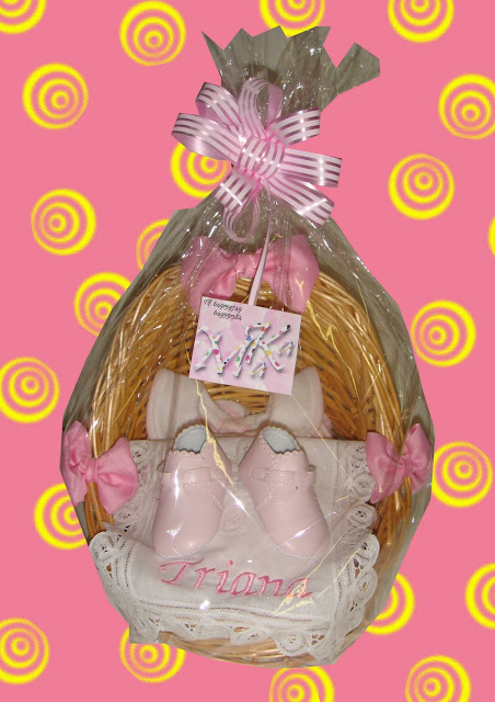 Esta cestita tiene forma de capazo, decorada con lazos rosa y un pañito de puntillas blanca. Para personalizarla le he bordado el nombre de la niña "TRIANA" sonbre dicho pañito. Contiene un par de pijamas y unos zapatitos de piel, aunque ya sabeis que el contenido puede variar en funcion de vuestro presupuesto.su precio fue de 25 euros