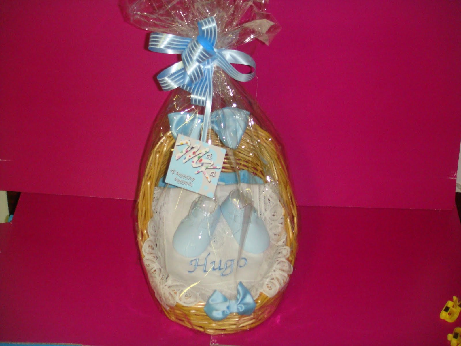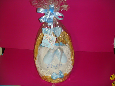Esta cestita de mimbre en forma de capazo lleva un par de pijamas, zapatitos, personalizada con el nombre del bebe, en este caso HUGO, bordado sobre un pañito con puntillas de encaje (si es asi su nombre que no lo se) y adornado con lazos celeste.