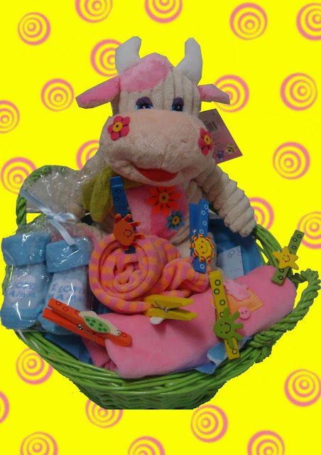 En esta ocasión me pidieron algo divertido para una mamá joven y su predilección por las pinzas decoradas. Ideé el regalo para sorprender a la mamá puesto que incluí un conjunto de dos piezas de primera postura con colores atrevidos, unos patucos con el mensaje "te quiero mama" (envueltos simulando el primer regalo de su bebé) todo para el bebé y las pinzas decoradas que tento le gustaban a ella ademas de un peluche con colores vivos, todo sobre una cesta de mimbre verde con el nombre tanto de la mamá como el de su bebé.